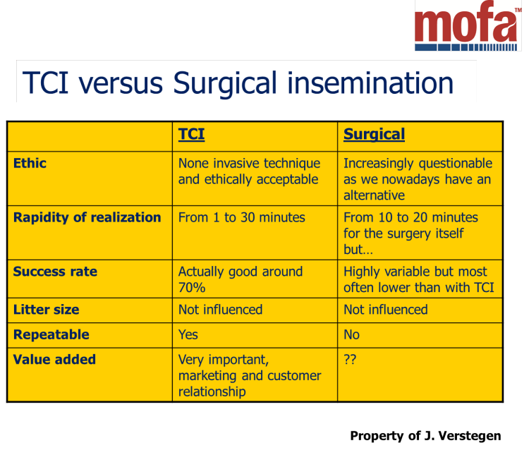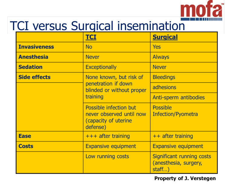 Last November, we had a great seminar focusing on “Recent Advances in Canine Reproduction” in Ontario, in partnership with Minitube Canada. One of the lectures was focusing on TCI (=Trans Cervical Insemination), a technique that uses vaginal endoscopy to visualize and catheterize the cervix of the bitch in order to perform an intra-uterine insemination. I am a big fan of this technique: I was using it daily in my previous position at the canine repro center in Paris. I asked my colleague from Minitube, Dr John Verstegen, if he could share with us two of his slides. You’ll find them below, it’s a comparison between TCI and surgical AI (aka “surgical implant”). Definitely worth having a look in my opinion !