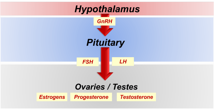 Fig 1: Organization of the reproductive function in dogs and cats / The hypothalamus and the pituitary are glands located in the brain. GnRH= Gonadotrophin-Releasing Hormone, FSH = Follicule Stimulating Hormone, LH= Luteinizing Hormone