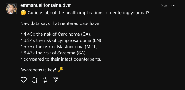 In many species, spaying seems to be associated with an increased in certain chronic inflammatory conditionsโฆ but cats are very different here actually!