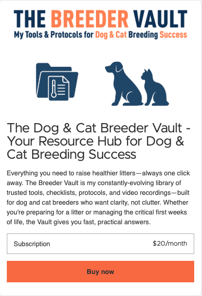 Ready to master calcium timing and selection for your breeding program? Join my Breeder Vault for immediate access to emergency decision flowcharts, product comparison guides, and breed-specific protocols that take the guesswork out of whelping support.