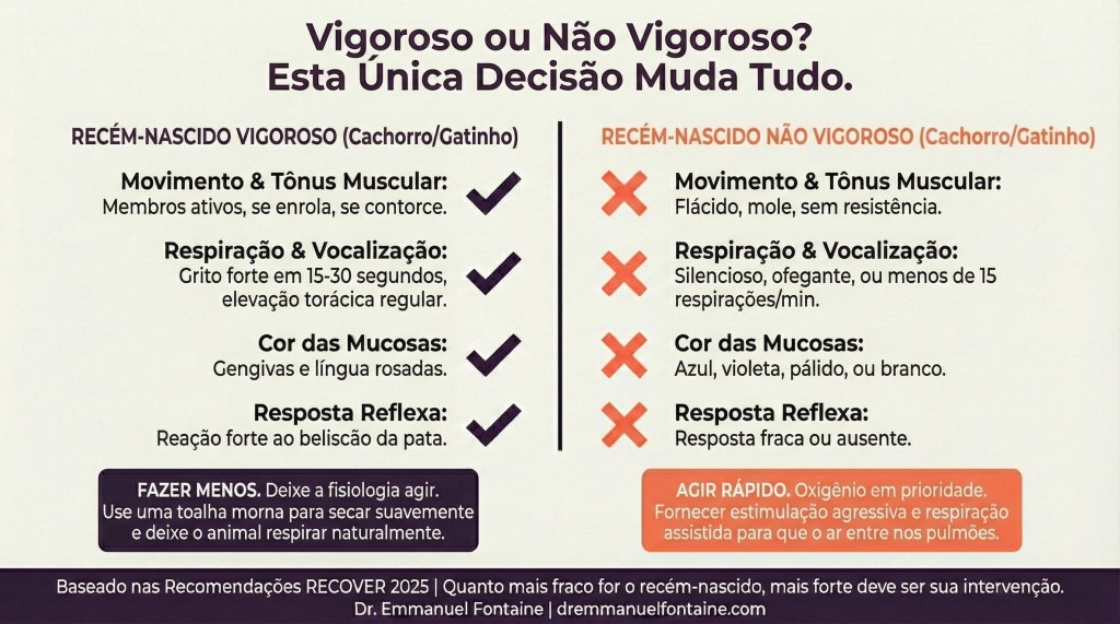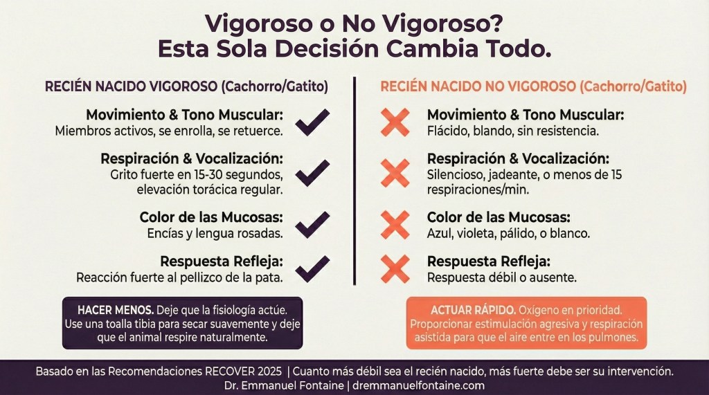 Si eres un criador intervencionista, tu monitoreo comienza en el segundo uno. ¿Sin llanto a los 20 segundos? Escalas. ¿Signos no vigorosos a los 30 segundos? Ya estás moviendo hacia apoyo de emergencia. Las guías RECOVER no reducen tu participación—la redirigen. Tus manos aún están activas desde el inicio, pero ahora están frotando, no succionando.