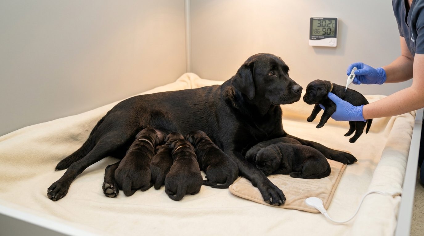 | Puppy skin temperature | 36–37 C (97–99 F) | Non-contact thermometer on chest wall between sessions | Once daily during first week | Below 35.5 C (96 F) on healthy puppy | Assess nursing; increase litter time on pad |