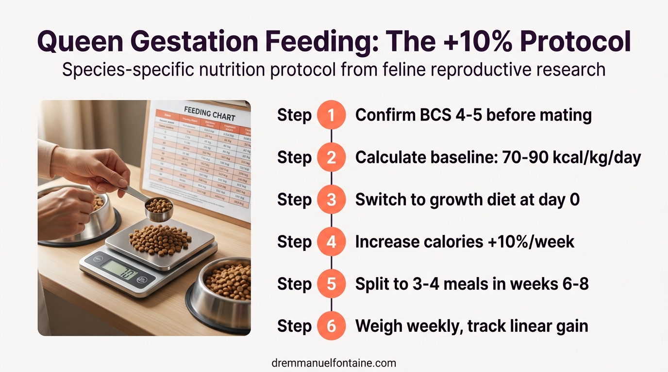 This does not mean queens should stay on maintenance calories throughout gestation. Queens need a gradual, controlled energy increase starting from the beginning of pregnancy. The real danger is sudden caloric excess, the kind that comes from aggressive flushing protocols borrowed from livestock. This post walks you through the science, the correct feeding protocol, and the monitoring that makes the difference between a litter of eight kittens and a litter of three.