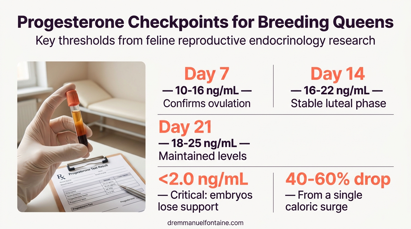Test at day 7 (should be 10–16 ng/mL, confirming ovulation), day 14 (should be 16–22 ng/mL, confirming stable luteal phase), and day 21 (should be 18–25 ng/mL, confirming maintained levels). Levels below expected ranges signal insufficiency. Queens that experience a progesterone crash from overfeeding will show falling levels at these checkpoints.
