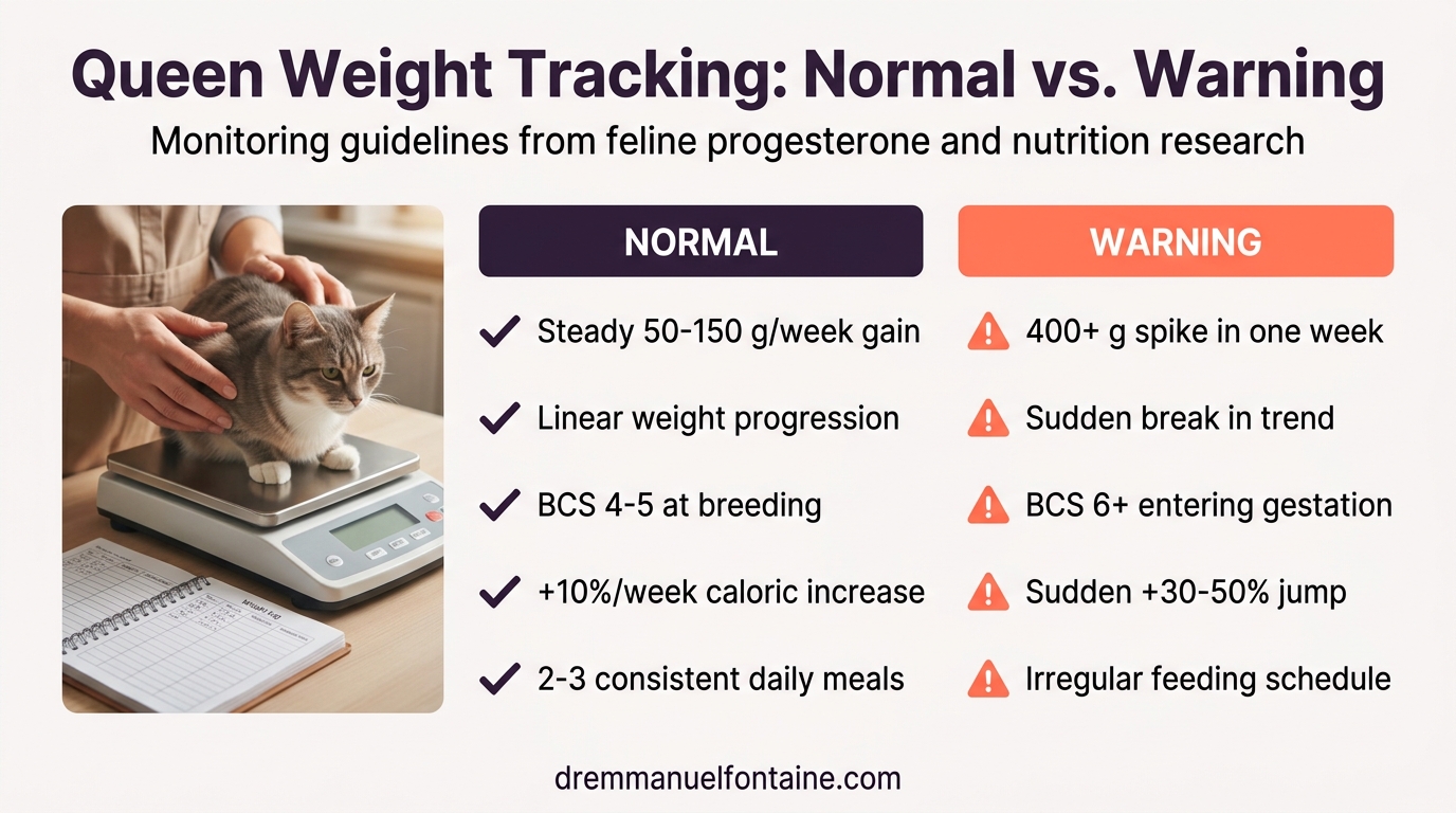 Monitor weekly weight for steady linear progression. Keep pre-breeding body condition at BCS 4–5. Work with your veterinarian on progesterone testing if litter sizes remain small. Your breeding queen has different reproductive endocrinology, different metabolic sensitivities, and different nutritional needs than livestock. Respecting those differences and building your protocols around feline biology rather than borrowed livestock practices is the foundation of consistent, healthy litters.