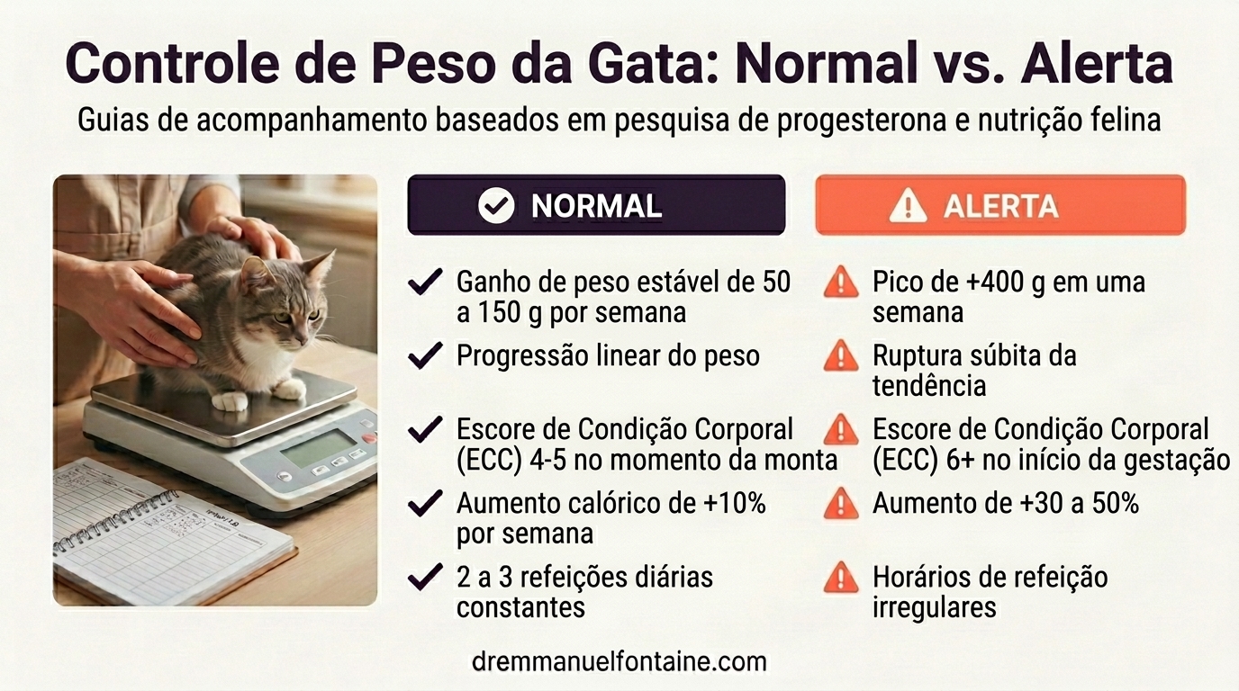 Flutuações de peso são diferentes do ganho de peso. Um ganho linear constante é esperado e saudável. O que sinaliza problema é um pico repentino: uma gata que ganha 400 g ou mais (14 oz ou mais) em uma única semana durante a gravidez precoce. Este tipo de pico reflete superalimentação, não crescimento fetal normal.