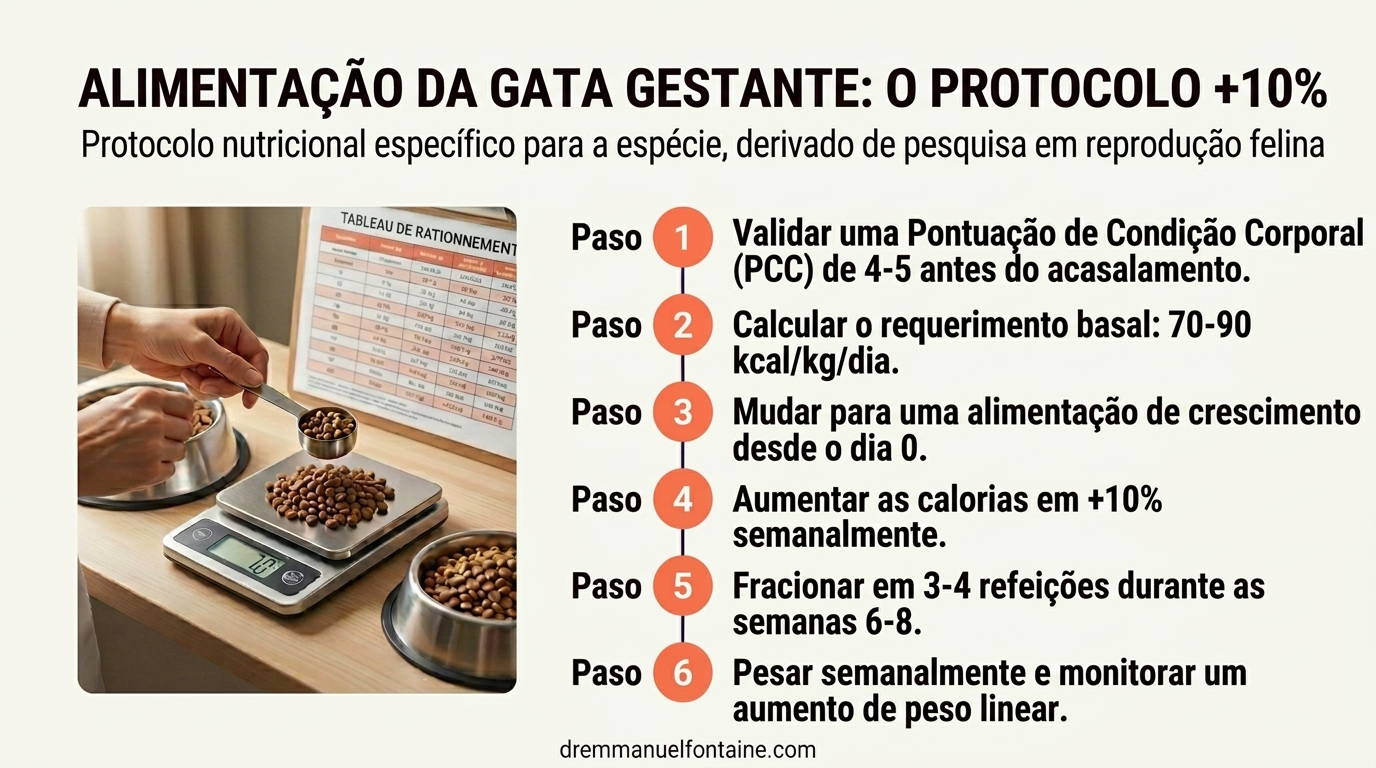O fundamento de uma boa nutrição reprodutiva é começar da linha de base correta. Uma gata em pontuação de condição corporal de 4 a 5 é ideal: você pode sentir as costelas facilmente, ela tem cintura visível e a sua retração abdominal é clara. Nesta condição, a sua taxa metabólica basal é previsível e a sua sinalização insulínica é estável o suficiente para tolerar os aumentos graduais de energia da gravidez.