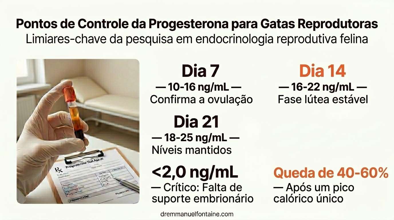 Teste no dia 7 (deve ser 10 a 16 ng/mL, confirmando a ovulação), dia 14 (deve ser 16 a 22 ng/mL, confirmando uma fase luteal estável) e dia 21 (deve ser 18 a 25 ng/mL, confirmando níveis mantidos). Níveis abaixo das faixas esperadas sinalizam insuficiência. Gatas que experimentam uma queda de progesterona por superalimentação mostrarão níveis decrescentes nesses pontos de verificação.