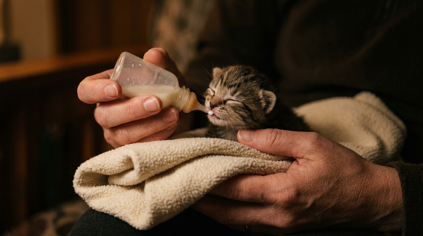 | Feed kitten milk replacer | Use a commercial formula designed for neonatal kittens. Feed every 2 hours. |