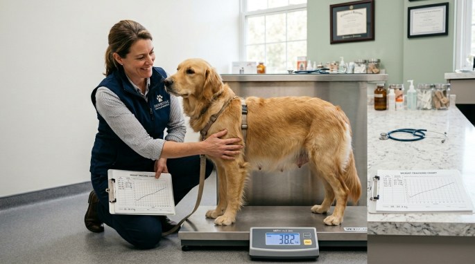 Your pregnant dog's weight tells you whether whelping will go smoothly or head toward dystocia. Here is the week-by-week protocol: zero gain for 40 days, then steady 15 to 25 percent gain through whelping, and the red flags your vet needs to see.